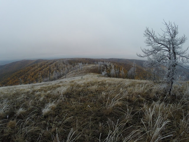 Грибники так и норовили потеряться. Поднялись на хребет Малая Крака и прошлись по нему. Наверху, в некоторых местах, красивейший осенний лес, покрытый изморозью.