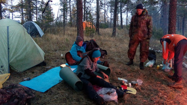 Часа через 3-4 неспешного хода, ближе к вечеру и концу хребта встаем на ночь. Гитара, песни у костра. Релаксационный походик для души и тела.