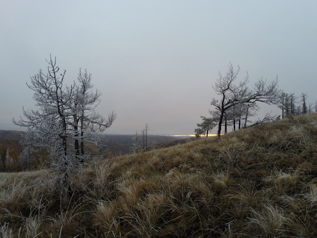 Грибники так и норовили потеряться. Поднялись на хребет Малая Крака и прошлись по нему. Наверху, в некоторых местах, красивейший осенний лес, покрытый изморозью.