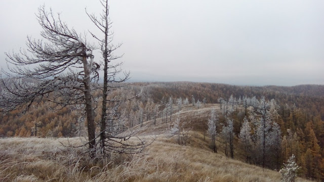 Грибники так и норовили потеряться. Поднялись на хребет Малая Крака и прошлись по нему. Наверху, в некоторых местах, красивейший осенний лес, покрытый изморозью.