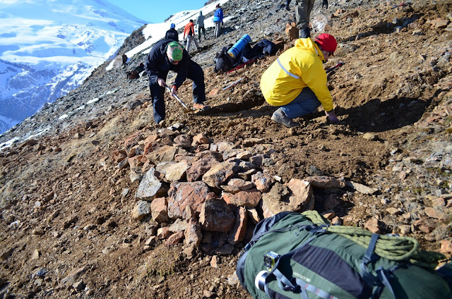 На высоте 3200 ставим лагерь, готовим площадки под палатки. Пробовал пробежаться пару десятков метров - накрывает. Одышка, но голова не болит и прочих симптомов горняшки нет. Хотя готовить площадку под палатку тяжеловато.
