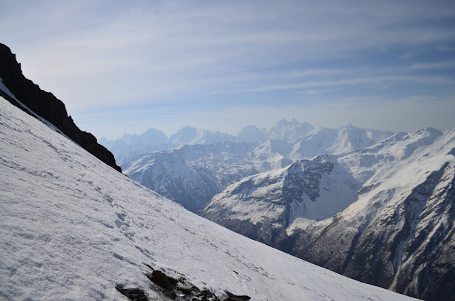 Продолжаем программу топтания по склону. Надо дойти до высоты около 5к, подышать, посидеть и вернуться уже в привычный лагерь. Погода отличная с самого утра, Волшебный вид на Главный Кавказский Хребет.
