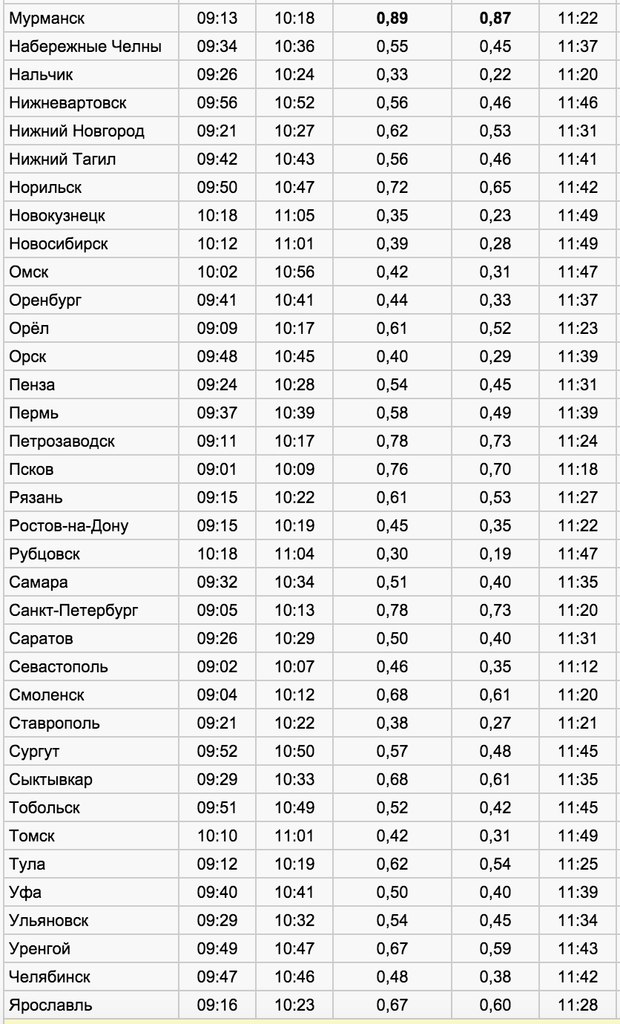 Время наступления основных моментов солнечного затмения 20 марта 2015 г. в городах России.
