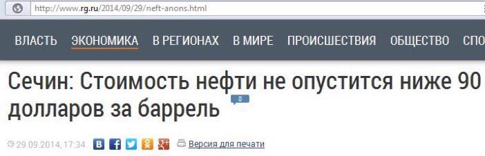 Глава «Роснефти» Игорь Сечин допускает, что цена на нефть может упасть до $60 за баррель и ниже. По его мнению, это может произойти к концу первого полугодия 2015 года. При этом, по словам Сечина, даже цена в $60 «тоже устраивает» компанию. Правда, в этих условиях некоторые проекты компании придется отложить |