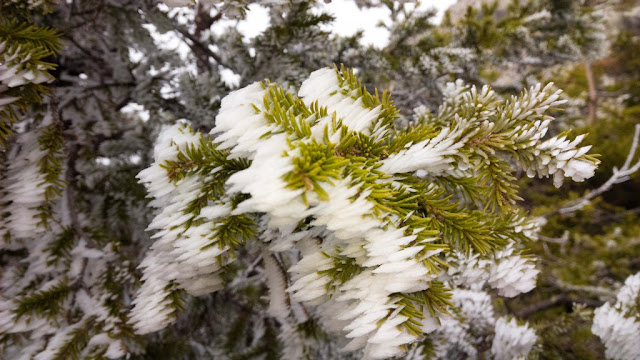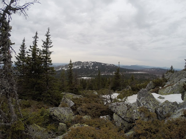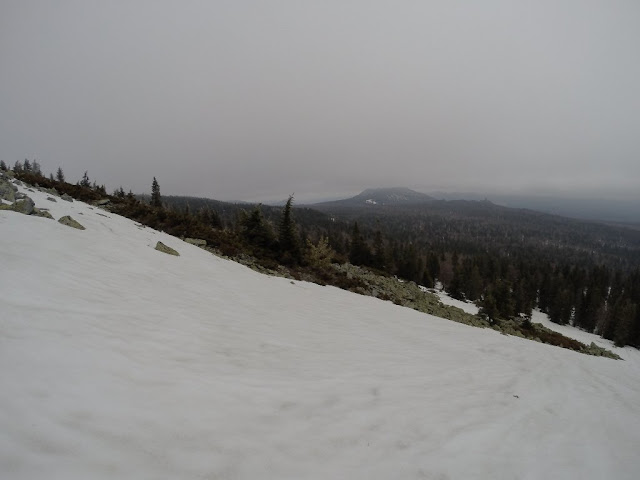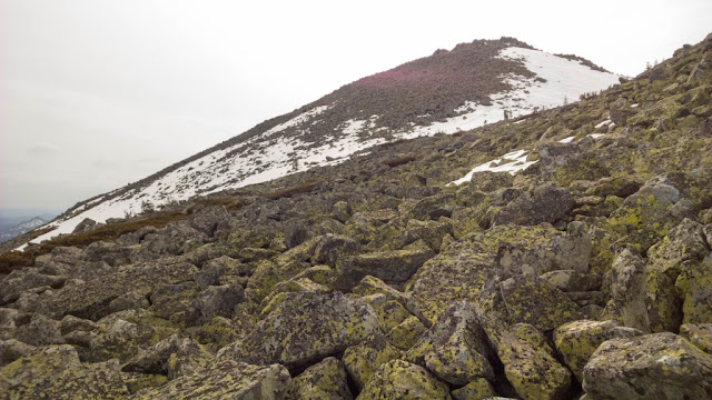 Подъем стандартно перемежающийся с курумом снег. Наверху плато со скальными останцами, редкие деревья в измороси.