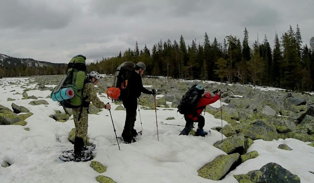 Пошли сквозь снег и болота верховья Большого Инзера в более цивилизованные места. Снег... снег... курумы под снегом... Миша ломает снегоступы... Берт ломает снегоступы... Попытка ремонта с куском трекинговой палки не дает особых результатов. Берт с Мишей героически по уши в снегу пытаются идти к цивилизации... Берт с Мишей героически идут на сломаных снегоступах, так как без них эпичность передвижения зашкаливает даже для этих крепких ребят...