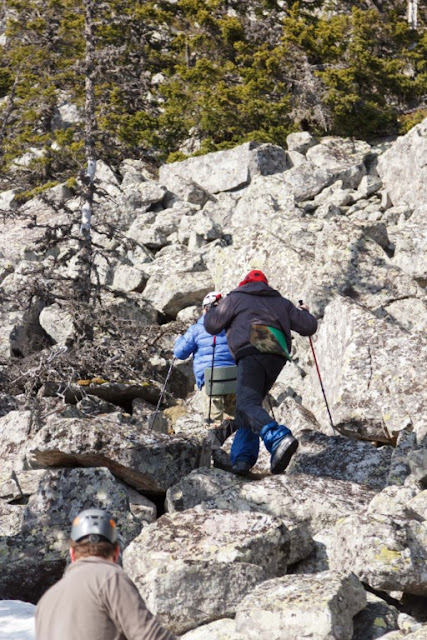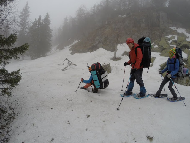 Спуск опять был веселый. 50 метров курума, 50 метров снега и далее полосами. Одел снегоступы, снял снегоступы, одел снегоступы и далее. 50 оттенков мазохизма. Миша радовался со словами "какая хорошая 1а".