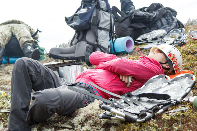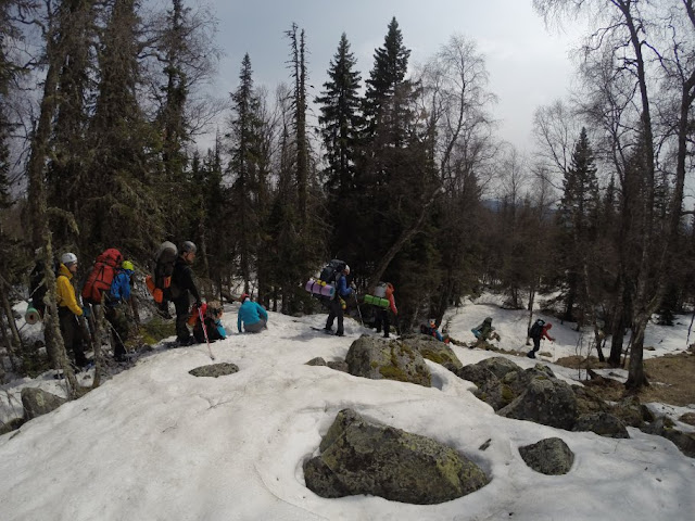 Про снегоступы отдельная песня. Какой бы не была весна, на майские выше некоторого уровня все равно снег, много снега, дофига снега. Без снегоступов ходить по верхам хребтов очень тоскливо. В них тоже бывает тоскливо, но зато можно выкроить время на групповой отдых пока реммастер занимается ступами особо удачливого участника. Мне сильно помог видный кумардолог и просто хороший человек Саша Миков, одолжив модные снегоступы. Остальные ребята, подавив робкое "может не понадобится", тоже разжились этим видом снаряги. Самые эпичные были у Светиков. Одна из самых отважных групп - Дины на пару дней раньше вышла на маршрут и подтвердила - снега хватит всем, даже можно продать излишки пингвинам или эскимосам.