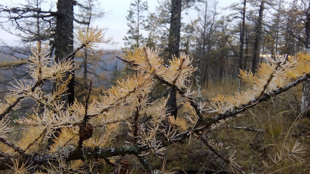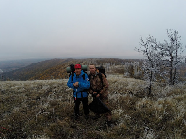 Грибники так и норовили потеряться. Поднялись на хребет Малая Крака и прошлись по нему. Наверху, в некоторых местах, красивейший осенний лес, покрытый изморозью.