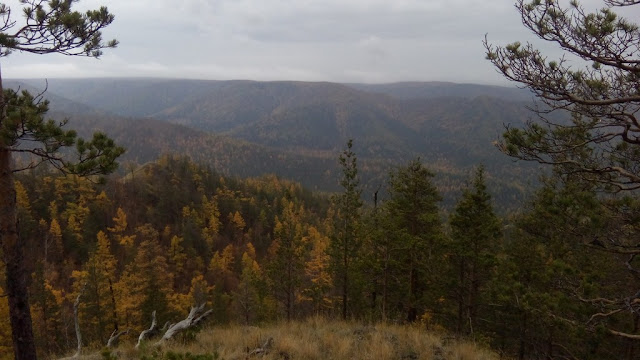 Прямо от дома идет через переулок дорога, которая постепенно уводит на гребень хребта Большая Крака. Тропинка очень четкая, помеченная краской вплоть до перемычки на Малую Краку. Влево посмотришь - красота, вправо - тоже замечательно. ) Узкий гребень с небольшими каменными выходами, идти легко, в принципе хороший вариант для похода с детьми. После Тянь-Шаня кажется идешь просто по холмам, перепады почти не чувствуются. Вбок уходят многочисленные ребра хребта. Видно что тут бушевали пожары - много обугленных деревьев (в этом есть и плюс - на хребте особо нет клещей).