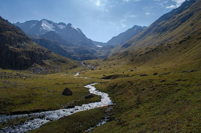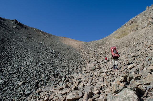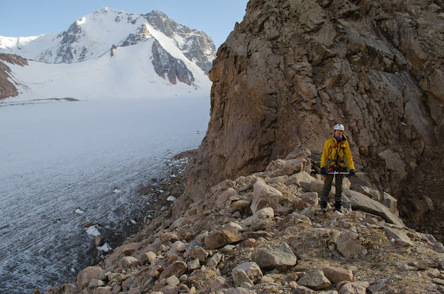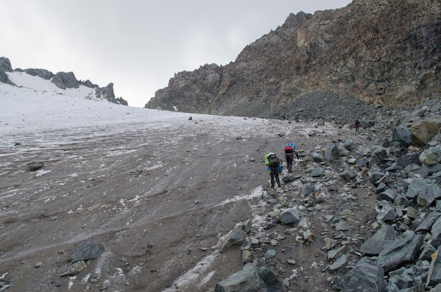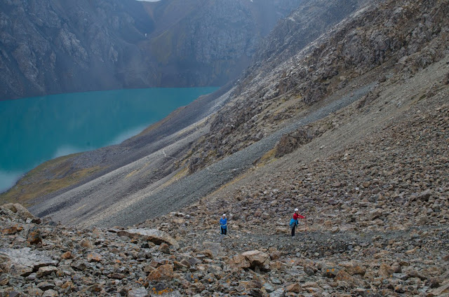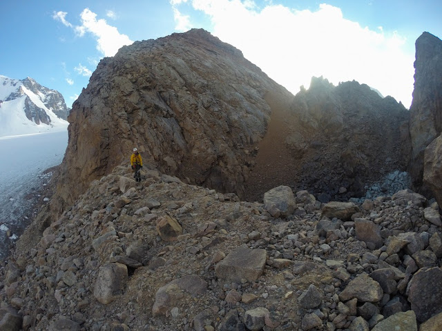 Спуск -сыпуха с приличным уклоном. Внизу встретили местного парня в шортиках и футболке, говорит "гуляю в том направлении", забрасывает для кого то груз. Еще сказал "был на Ленина, чуть не помер" - тяжел портерский хлеб. Я немного не понял как и для кого он несет груз. Не очень логичный перевал в плане логистики.