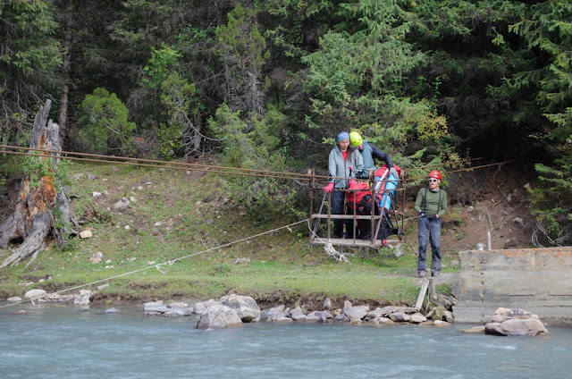 Недалеко от их стоянки переправа через реку натянуты два стальных каната, по ним на вагонетке переправились по очереди через реку. Те кто сидят в тележке работают руками, назад конструкция вытягивается какой то хлипкой веревочкой. Кстати эта переправа обозначена на достаточно древних картах.