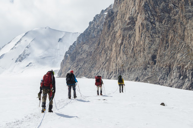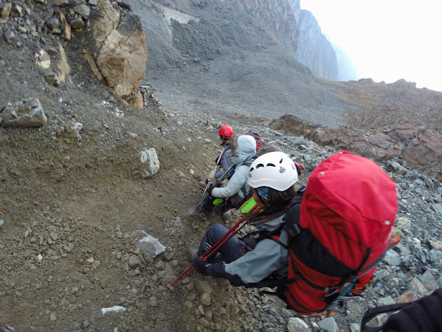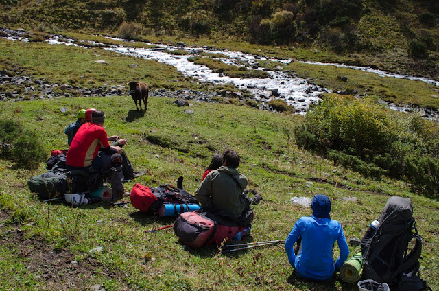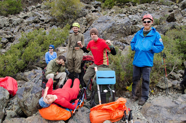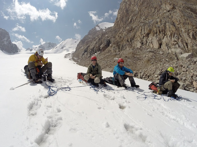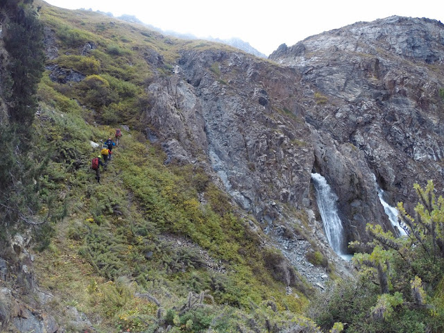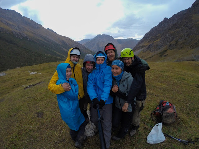 Пятый день для меня в любом походе - самый лучший. Физуха приходит в норму, вхожу в ритм, и сейчас я чувствовал себя отлично (да, простыл как и все, кашлял, но это мелочи), у остальных дела похуже, девочки реально устали, и даже железный Вова признается что это второй по тяжести поход в его жизни (в плане самочувствия, не препятствий). Бикки ворчит "надо рожать детей и печь пирожки, а не шарахаться по горам", мы убеждаем, что все будет после пятерки. Наделает детей, будет своя личная команда горников. Мы представили как к концу второго дня провешивания веревок, в трудной шестерке, подымаемся на перевал 3б*, а тут Светик "Ребята, я тут с мальчиками вам пирожков принесла свежих".