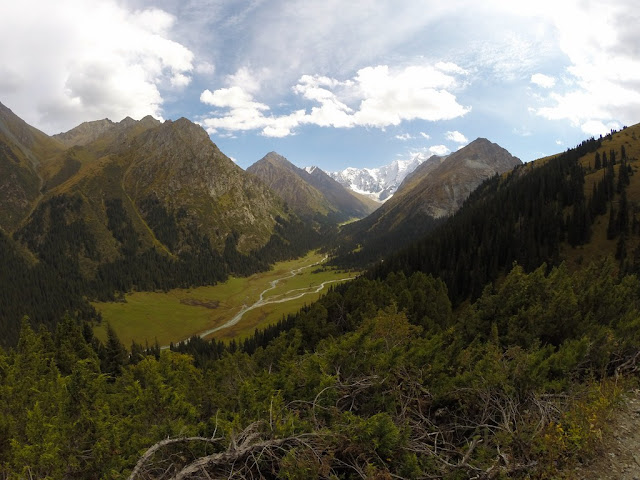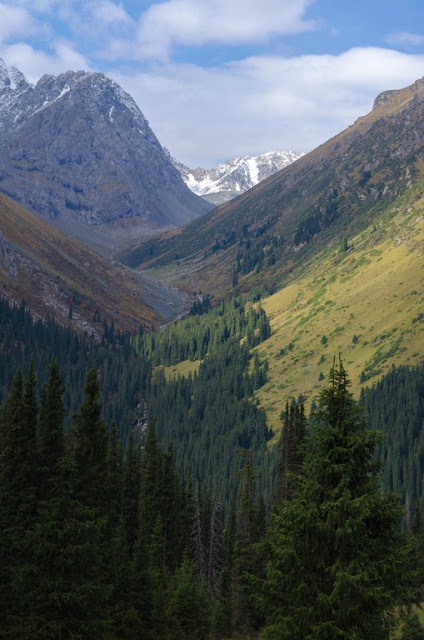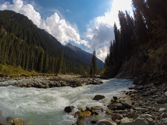 Подымаемся вдоль реки Каракол до подьема на озеро Алакель. Здесь гиганские сосны, бурная речка (мечта каякера), заметно прохладнее и влажнее чем в Бишкеке. Дорога прижимается к реке, в некоторых местах немного подымаясь над ний.