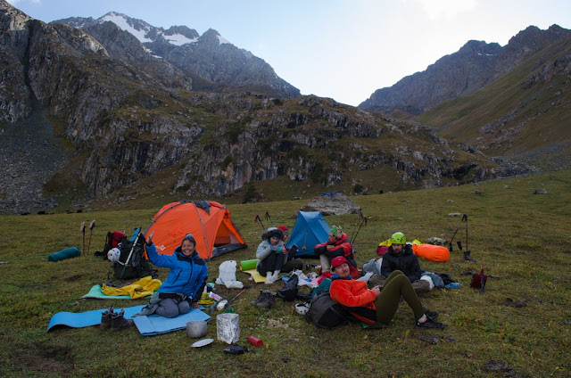 На пути назад я замыкаю - спешить особо некогда. На противоположном берегу периодически раздается "бубух" - камушки сыплются к озеру. В одном месте нас поджидает Вова и говорит - быстро пробегаем этот участок - тут тоже камнепады. Родной лагерь. С одной стороны хорошо - красиво очень, с другой прилично плющит, мы с Артуром были дежурными, сходить сотню метров за водой почти подвиг, тяжко.