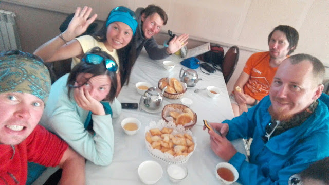 Остановились поесть в придорожной кафешке с вайфаем, передали привет друзьям. Вова предостерегает - "не больше одного местного блюда, а то будете мучатся с животом в начале маршрута". Я навернул лангманчика и мантов, Еще за Бертом доел пол лангмана. Получилось 2.5 местного блюда. + Компот и кумыс. Жизнь резко наладилась. Затарились на вечер самсой, лангманом и лепешками.
