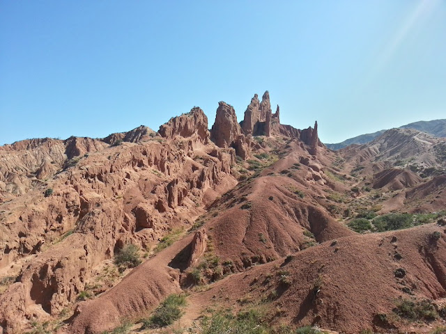 В Киргизии спешить не принято. В очередной раз мы убедились в этом следующим утром. Вызвав два такси "ждите нас через пол часа" мы прождали часа два. До Покровки (Кызылсуу) доехали минут за 40, дорога плохая, периодически приходилось выходить из машины и пешком обходить лужи. При приближении к озеру горы измельчали и приобрели красивый красный оттенок, растительность стала реже и суккулентистей.