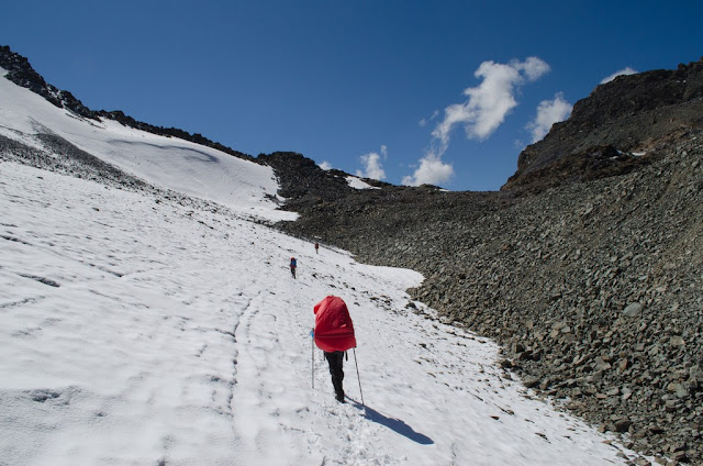 Перевал показался нам достаточно тяжелым. С той стороны, с которой мы шли, был открытый ледник, крутизной градусов до 20-25, часть мы прошли просто в кошках, ближе к седловине пришлось пробросить пару веревок. Обычно он покрыт снегом по колено, и просто протрапливается, но нам не повезло. Илюха как спортивный парень полез делать станции, я замыкал и снимал.