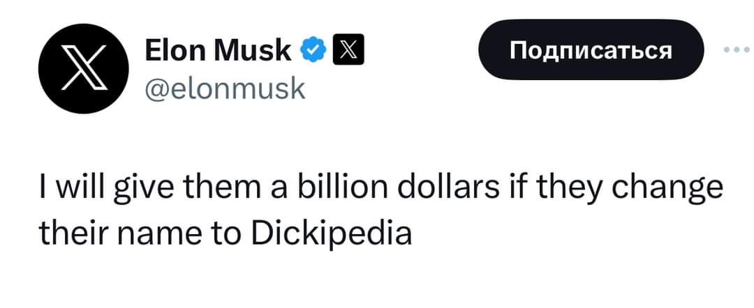 "Илон Маск в ответ на очередной призыв Википедии помочь ей со средствами на хостинг, предложил миллиард долларов, если Википедия назовется Хуепедией. Это у него такой юмор. Такой вот теперь у человечества самый богатый визионер, который мечтает о полете на Марс."