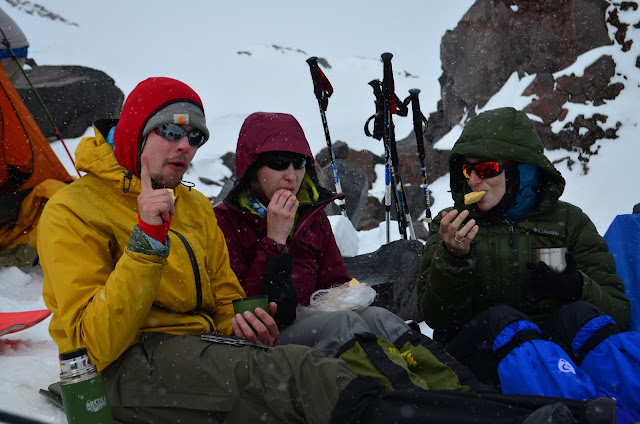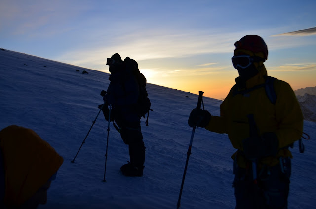 Тут около 10 вечера снаружи шубуршание. Оказывается Ренат, которого сильнее всего крыло горняшкой, начал себя странно вести. Судя по признакам, у него начинался отек легких. Берт - сенсей срочно увез его вниз, сначала на снегоходе, потом на подьемнике. Мне сказал чтобы я с утра повел группу непосредственно на восхождение.